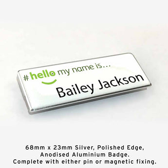 68mm x 23mm - Silver, polished edge, anodised aluminium badge
